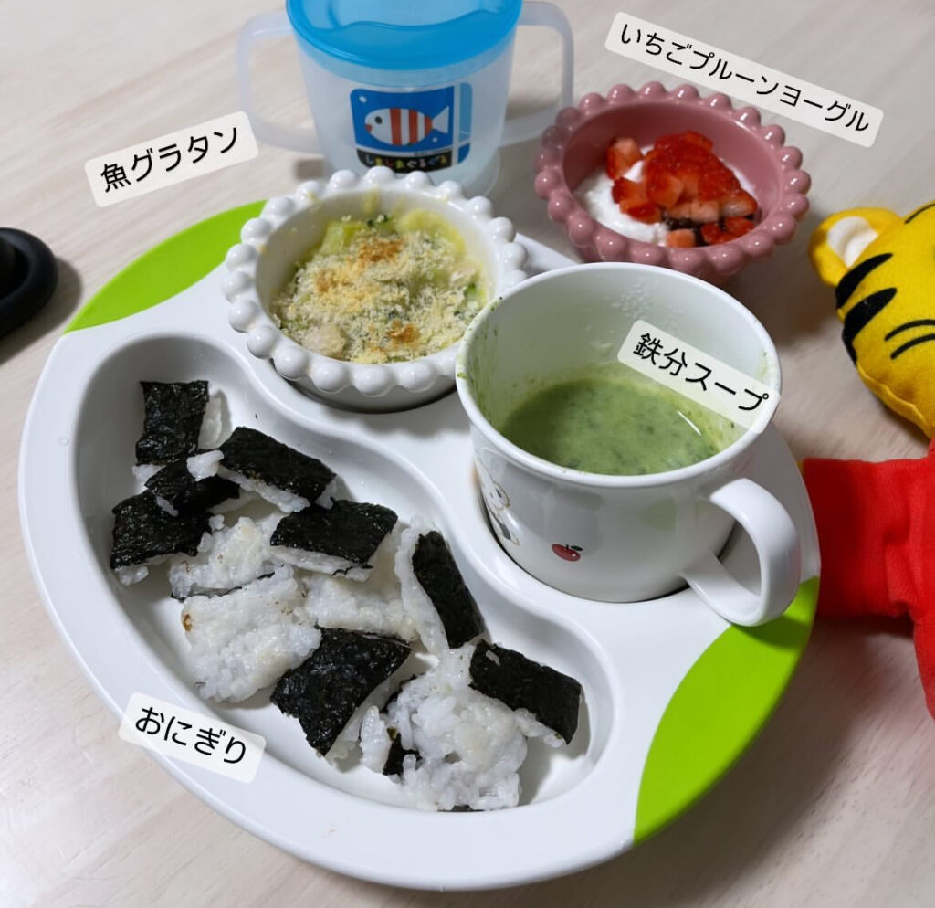 最初は本当に詰め込めるだけ詰め込もうとするので「お口の中なくなってからね。」と繰り返し伝えて口の中がなくなってからお皿に追加していきましょう。